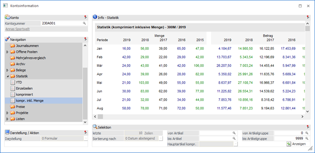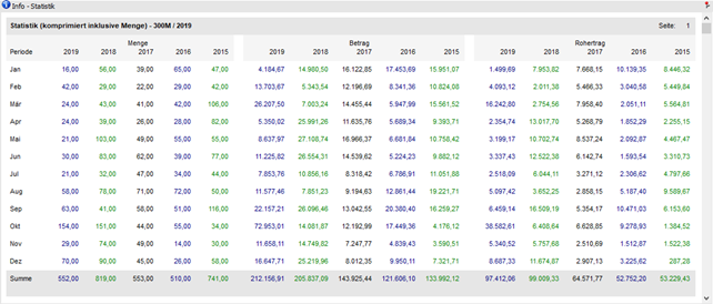 In dieser Ansicht werden die Statistikzeilen (Menge, Betrag und Rohertrag) für das aktuelle Jahr, sowie für 4 Vorjahre (nach Monaten kumuliert), angezeigt.