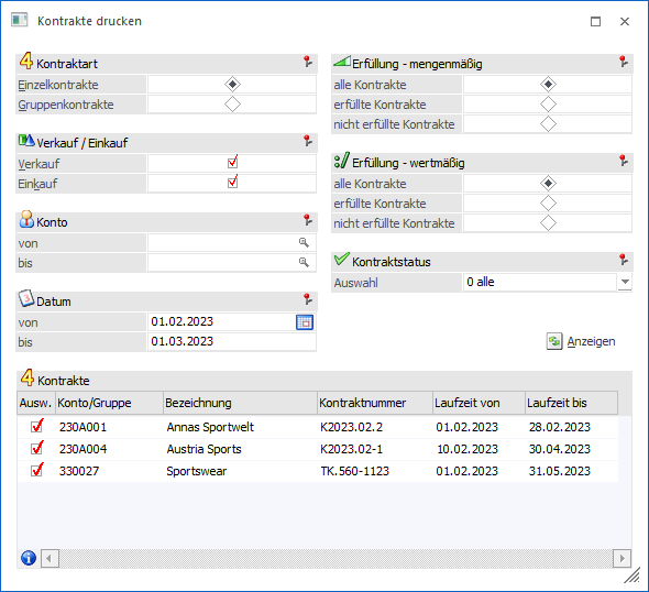 Durch Anwahl des Buttons "Anzeigen" wird die Tabelle "Kontrakte" gemäß der zuvor getätigten Selektion gefüllt.