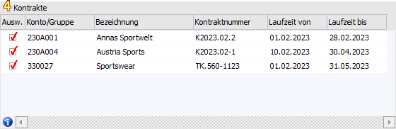 Hier kann eine Selektion aufgrund der Laufzeit des Kontrakts erfolgen (wird mit dem Tagesdatum vorbelegt).