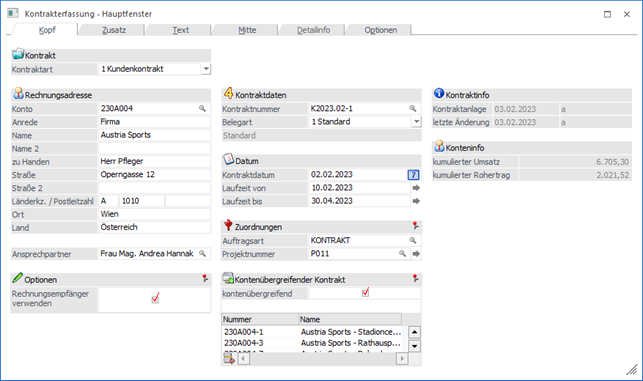 Register "Kopf" können neue Kontrakte erstellt oder bestehende editiert