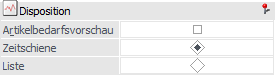 Durch Aktivierung der Option "Artikelbedarfsvorschau" wird die Artikelbedarfsvorschau aufgerufen und mit den Daten zum jeweiligen Artikel gefüllt. Über die Auswahl "Zeitschiene" oder "Liste" kann dabei die Art der Bedarfsvorschau definiert werden.