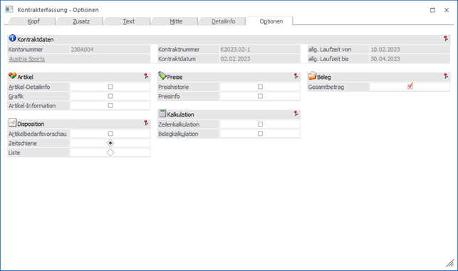 In dem Register "Optionen" kann u.a. eingestellt werden, welche Informationen während der Kontrakterfassung zusätzlich zur Verfügung stehen sollen. Alle Einstellungen werden hierbei benutzerspezifisch gespeichert!