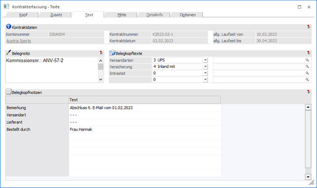In dem Register "Text" kann ein Kontrakt mit zusätzlichem Informationstext versehen werden.