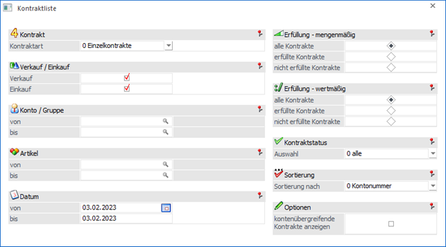 Folgende Einstellungen und Selektionsmöglichkeiten stehen für die Ausgabe der Kontraktliste zur Verfügung:
