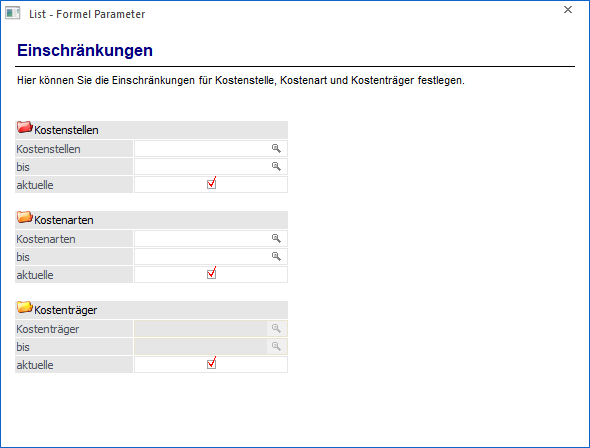 Mit dieser Funktion kann das Kostenstellenbudget abgefragt werden. Auch hier können folgende Einschränkungen vorgenommen werden.