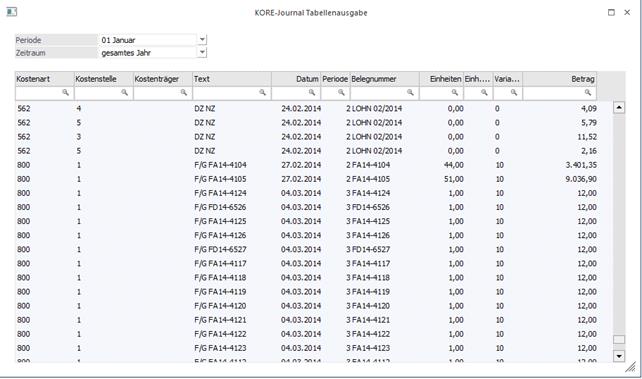 Die Basis der Journalzeilen in der Tabelle bildet immer die zuvor getroffene Selektion im KORE-Journal. D.h. in der Tabelle kann dieses Datenmaterial nur weiter eingeschränkt werden.