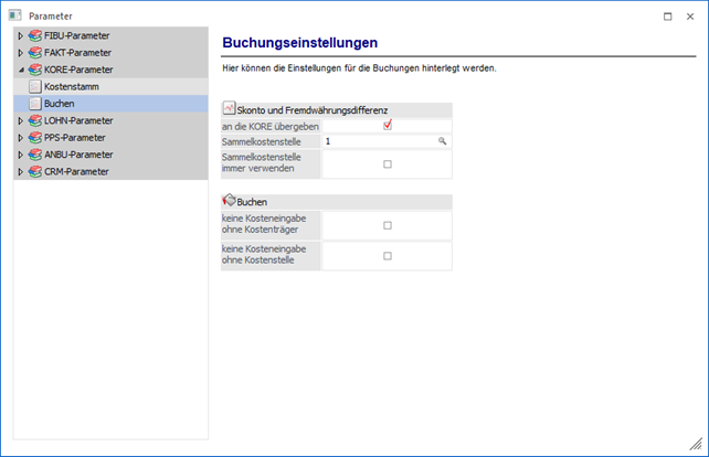 Über den Bereich "KORE-Parameter - Buchen" können Einstellungen für die Buchungen hinterlegt werden.