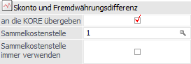 Wird diese Option aktiviert, so wird bei der Übergabe des Skontos (und der FW-Differenzen) in die KORE immer fix die eingestellte Sammelkostenstelle verwendet.