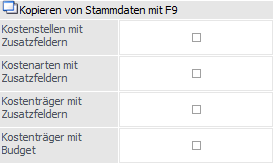 Ist diese Option aktiv und es werden bei der Neuanlage von einer Kostenstelle die Daten von einer bestehenden Kostenstelle mit F9 übernommen, dann werden auch die Zusatzfelder mit übernommen. Ist die Checkbox inaktiv, und ein Datensatz wird übernommen, dann bleiben die Zusatzfelder leer.