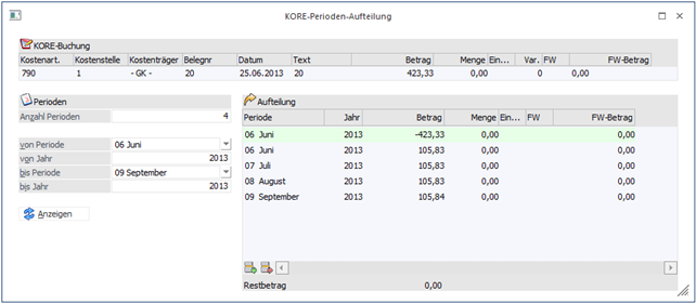 Periodenaufteilung erfasst wurde. Wird im Buchungsfenster der KORE-Betrag