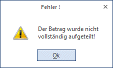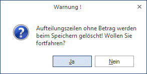 Mit dem OK-Button wird die Aufteilung in das Buchungsfenster übernommen, wenn sich der Restbetrag auf 0 beläuft. Aufteilungszeilen mit Betrag 0 werden nach der Abfrage