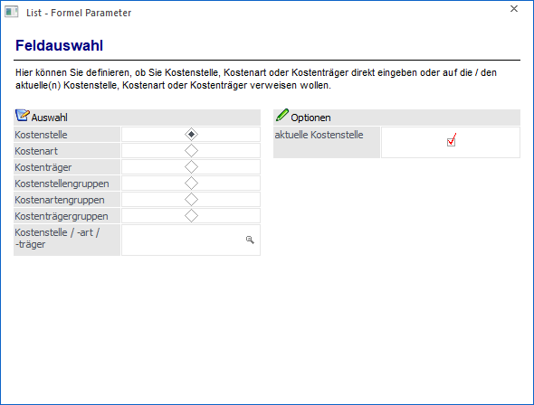Mit dieser Funktion kann die Bezeichnung von Kostenstellen, -arten, -träger oder von Kostengruppen angezeigt werden.