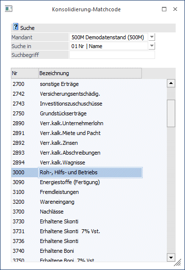 Bei dieser Zuweisung wählt man die Kostenart des Hauptmandanten und sucht in allen Mandanten nach der Nummer oder dem Namen (Bezeichnung) des passenden Kontos. Über das Flag kann jetzt eine Konsolidierung der Kostenart 460 aus dem Mandant 300M mit der Kostenart 4240 aus dem Mandant 500M konsolidiert werden.