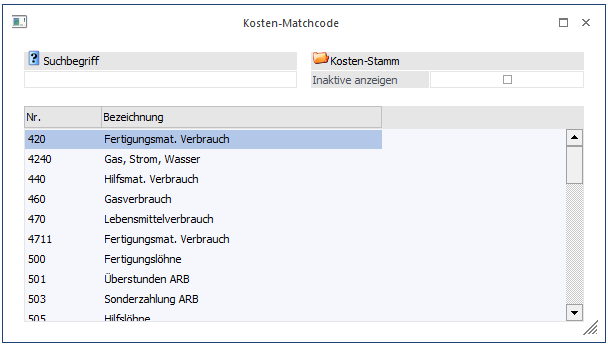 Wird der Kosten-Matchcode zur Suche einer Kostenart im Fenster "Kostenträger - Budget" aufgerufen, so werden je nach Kostenstelle entweder nur Einzelkostenarten oder nur Erlöskostenarten im Matchcode angezeigt.
