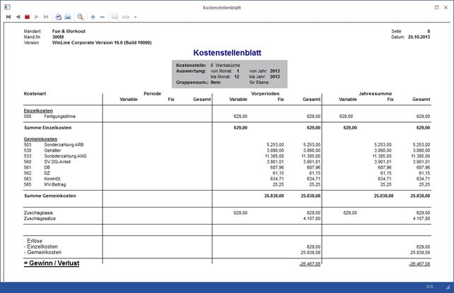 Kostenstellenblatt mit Anzeige der Periode, Einheiten, Jahressumme. Aus