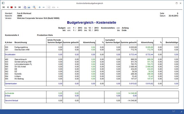 In dieser Auswertung werden für den selektierten Bereich der Kostenstellen für jede gebuchte Kostenart die IST-Kosten den budgetierten Kosten gegenübergestellt und die daraus resultierende Abweichung (absolut und in Prozent) berechnet und ausgewiesen.