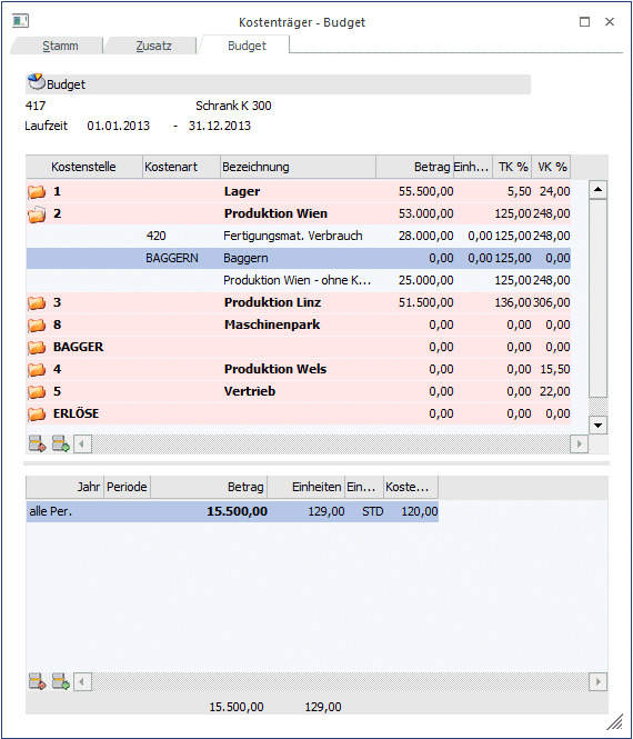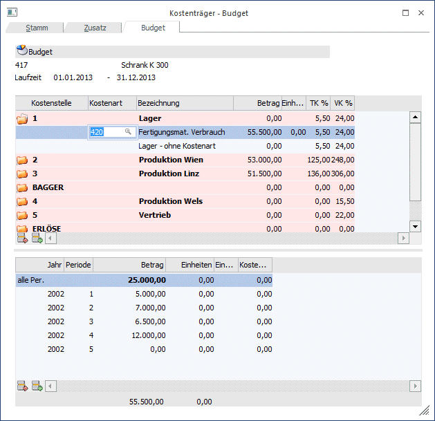 In obigem Beispiel erfolgte die Auswahl des Kostenträgers "417". Im Register Budget wird für die Kostenstelle Produktion Wien die Plankostenart "Baggern" ausgewählt. Dadurch können im unteren Fensterbereich aufgrund der Laufzeit pro Periode die Plankosten eingetragen werden.
