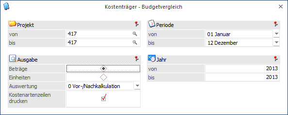 können für Projekte (Kostenträger) auf Basis von Beträgen oder Einheiten die Auswertungen für die Vor-/ und Nachkalkulation, bzw. ein Budgetvergleich mit einer Abweichungsanalyse abgerufen werden. Bei der Ausgabe auf Basis von Beträgen erhalten Sie die gebuchten Kosten in der traditionellen Vollkostenrechnung und ebenso die Teilkostenrechnung dargestellt. Für die Auswertung der Vor-/ und Nachkalkulation und auch für den Budgetvergleich mit Abweichungen können ergänzend die Kostenartenzeilen angedruckt werden.