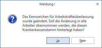 Wenn diese Option gesetzt ist, wird gemäß § 22c und 22d AÜG ein Arbeitskräfteüberlassungs-Beitrag eingehoben. Diese Option muss in den Betriebsdaten aktiviert werden, damit sie auch den AN entsprechend berücksichtigt werden kann. Wenn der Betriebsdatenstamm mit aktivierter Option gespeichert wird, erfolgt die Abfrage, ob diese Einstellung auf alle Arbeiter dieser Krankenkasse übernommen werden soll: