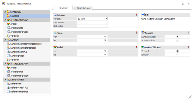 Mit Hilfe der Auswahlfelder kann definiert werden, ob die Auswertung kundenorientiert (Auswahl "Kundenstatistik") oder artikelorientiert (Auswahl "Artikelstatistik") dargestellt werden soll.