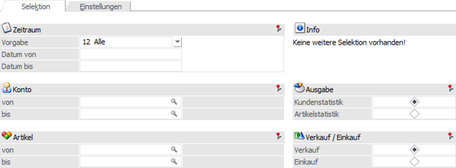 Bei einem Wechsel der Auswertungsmethode werden die bisher getätigten Selektionen übernommen (siehe "Info"). Eine Ausnahme bildet hierbei die Kontonummer. Dieses wird nur übernommen, wenn man innerhalb des Auswertungsbereichs "Verkauf" bzw. "Einkauf" navigiert.