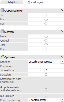 Eine Auswahl von "nur Summen" ist nur dann möglich, wenn unter dem Bereich "Summen" die Einstellung "Monat", "Quartal" oder "Jahr" getroffen wurde.
