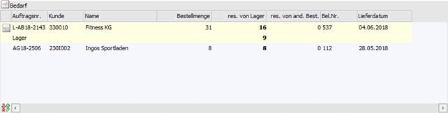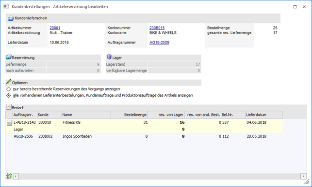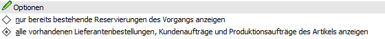 Bei der Aktivierung dieses Radiobuttons werden neben den Reservierungen des Vorgangs und dem Lager alle weiteren Kundenaufträge bzw. Produktionsaufträge des Artikels angezeigt, bei denen eine Reservierung vom Lager vorliegt.