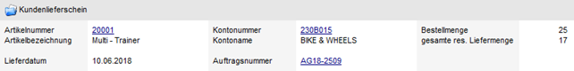 In diesem Bereich wird Auskunft über den aktuellen Artikel, des geplanten Lieferdatums (gemäß Kundenauftrag) und des Kundenauftrags gegeben. Zusätzlich wird unter "gesamte res. Liefermenge" dargestellt, wieviel insgesamt vom Lager ausgeliefert werden soll.