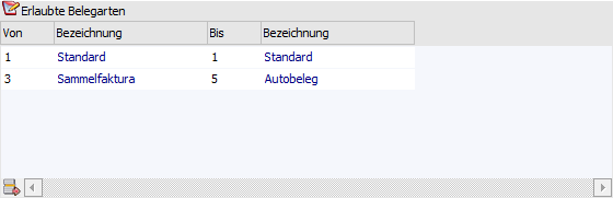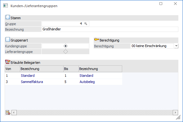 In den Feldern "von" und "bis" kann jeweils der Bereich der Belegarten eingegeben werden, der für diese Kunden- / Lieferantengruppe zulässig ist.
