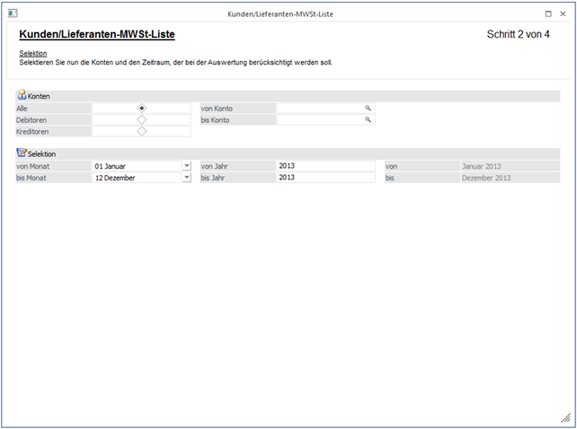 In diesem Schritt wird die Selektion der Konten vorgenommen und der Zeitraum für die Auswertung wird festgelegt.