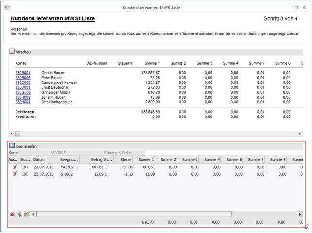 Durch einen Klick auf die Kontonummer wird das Fenster erweitert, in dem die Journalzeilen für das Konto in einer Tabelle angezeigt werden.