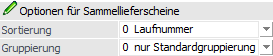 Innerhalb der Belegerfassung besteht die Möglichkeit ein Gruppierungskennzeichen pro Beleg zu hinterlegen (Register "Zusatz" - Feld "Gruppierung (SLS/SFA)"). Ob bzw. wie sich dieses Kennzeichen bei der Erstellung der Sammellieferscheine auswirkt, kann mit Hilfe der Option "Gruppierung" definiert werden.