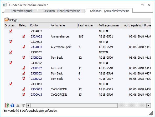 In der Tabelle werden die entstehenden Sammellieferscheine (Option "Drucken" steht zur Verfügung und die Kontonummer wird in schwarzer Schrift dargestellt) und die darin enthaltenen Aufträge (Option "Beleg" steht zur Verfügung und alle Daten des Belegs) aufgeführt. Hierbei stehen diverse Einstellungen zur Verfügung bzw. werden folgende Informationen angezeigt.