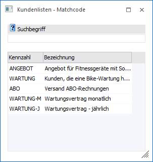 In der Tabelle werden nach Auslösen der Suche (Suchbegriff bestätigen) die gefundenen Kundenlisten mit ihrer Nummer und Bezeichnung angezeigt. Per Doppelklick oder Enter-Taste kann die ausgewählte Kundenliste anschließend in das Ausgangsfenster übernommen werden.