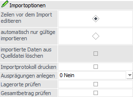 Für Artikel mit hinterlegter Lagerortstruktur kann an dieser Stelle entschieden werden, ob mögliche Lagerort-Eigenschaften bzw. Lagerort-Zuordnung geprüft werden sollen. D.h. wird ein Lagerort angegeben, welcher z.B. lt. Zuordnung verboten ist, so würde der Import bei aktivierter Option nicht möglich sein.