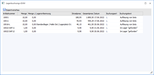 Wenn bei einem Export im Lagerbuchungs-EXIM der Button "Exportvorschau" angewählt wird, dann wird der Bereich "Exportvorschau" geöffnet. In diesem ist ersichtlich, welche Buchungszeilen exportiert werden.
