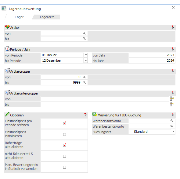 Im Programm "Lagerneubewertung" stehen folgende Selektionen und Einstellungen zur Verfügung: