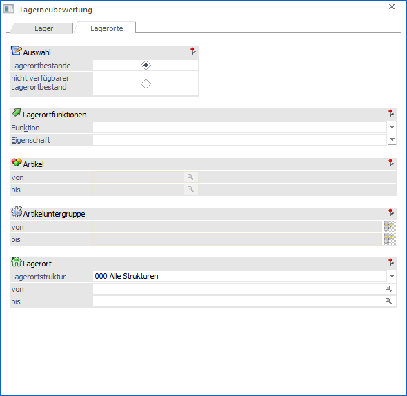 Wenn die Lagerortbestände neu ermittelt werden sollen, so können über den Bereich "Lagerortfunktionen" nach Lagerortfunktionen und Eigenschaften der Lagerorte selektiert werden.