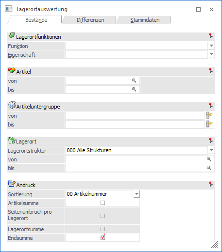 … aufgerufen wird, kann eine Bestandsliste der Lagerorte, eine Differenzliste (Lagerstand zur Summe der Bestände der Lagerorte) oder eine Stammdatenliste ausgegeben werden.