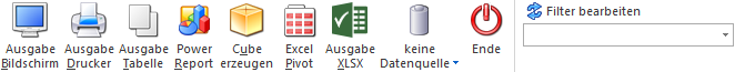Der Button "Datenquelle verwenden" wird nur angeboten, wenn für diesen Bereich (bezogen auf den aktuellen Benutzer / Mandanten) zumindest eine private oder öffentliche Datenquelle existiert. Des Weiteren stehen die Ausgabevarianten "Ausgabe Bildschirm", "Ausgabe Drucker" und "Ausgabe Tabelle" nicht zur Verfügung.