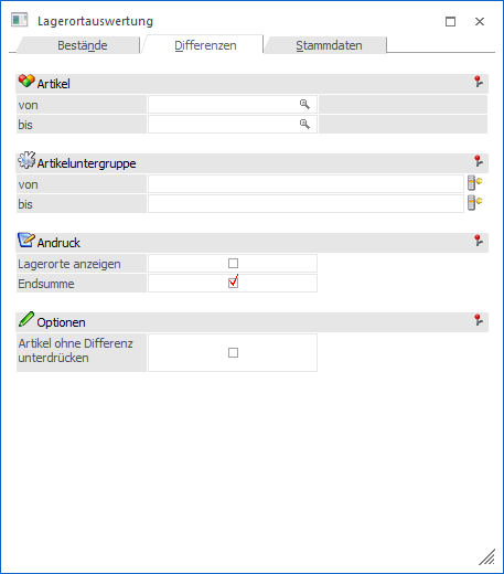Durch Aktivierung dieser Option werden nur die Artikel angezeigt, welche eine Differenz zwischen Bestand / Bestand2 und Lagerstand / Lagerstand2 aufweisen.