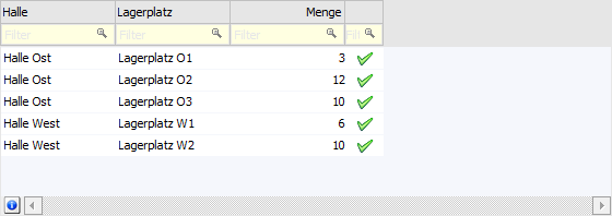 In der Tabelle der Lagerorte werden die erfassten Lagerorte mit den jeweiligen Mengen dargestellt. Mit Hilfe der rechten Maustaste (Funktion "Spalten anzeigen / verstecken") können diverse optionale Spalten eingefügt werden.