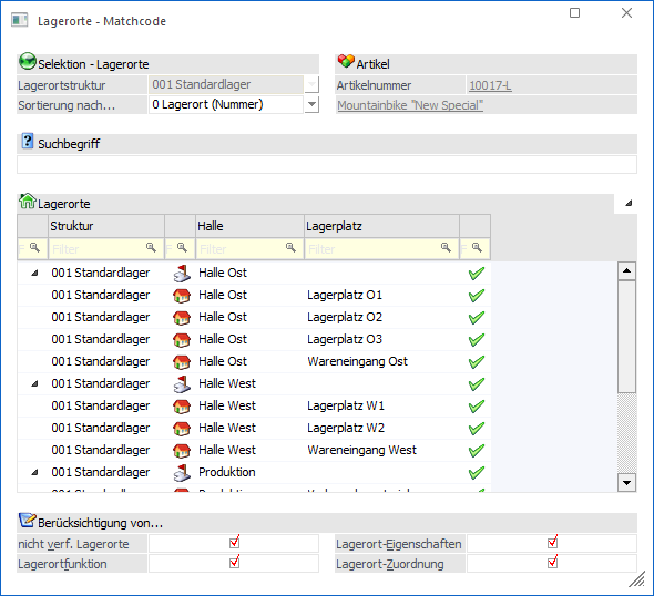 Wird der Matchcode im Kontext eines Artikels geöffnet, so kann an dieser Stelle definiert werden, ob die Lagerort-Zuordnungen bei der Anzeige der Lagerorte berücksichtigt werden sollen oder nicht.