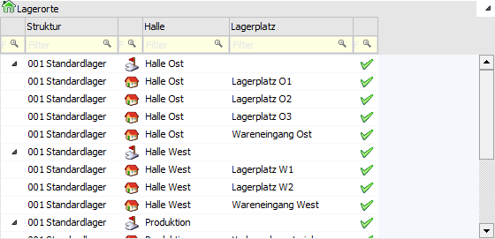 Die Anzeige bzw. Auswahl der Lagerorte kann durch die Eingabe eines Suchbegriffs eingeschränkt werden. Die Suche erfolgt hierbei in jenen Feldern, die in der Tabelle "Lagerorte" angezeigt werden (im Standard "Struktur und "Lagerort 1 bis 6").