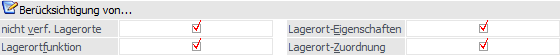 Wird der Matchcode im Kontext eines Artikels geöffnet, so kann an dieser Stelle definiert werden, ob die Lagerort-Eigenschaften bei der Anzeige der Lagerorte berücksichtigt werden sollen oder nicht.