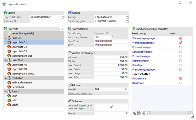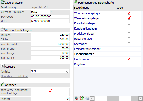 Nach Auswahl eines Lagerortes stehen im rechten Bereich des Fensters die Einstellungen des Ortes zur Verfügung.