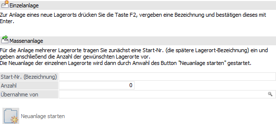 Der Bereich "Neuanlage" steht im rechten Bereich des Fensters zur Verfügung, wenn in dem Lagerortbaum der Eintrag "Neuer Eintrag (xxx)" bzw. der Button "Neuer Eintrag (xxx)" (unterhalb des Baums) ausgewählt wurde. Über diesen können mehrere Lagerorte, mit einer fortlaufenden Nummerierung, automatisiert angelegt werden
