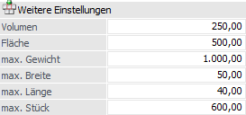 Mit Hilfe der folgenden Felder können die Maßangaben pro Ort definiert werden: