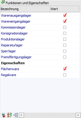 In dem Bereich "Funktionen und Eigenschaften" können jedem Lagerort Elemente zugewiesen werden, wodurch die weitere Nutzung in WinLine gesteuert wird.