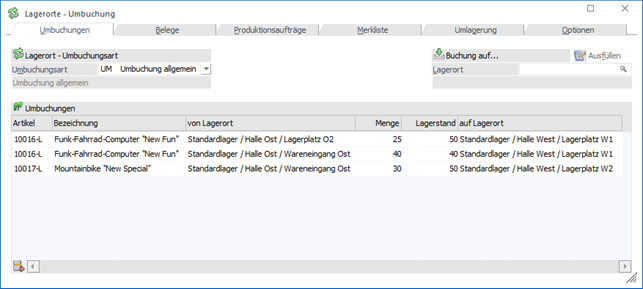ü In der Umbuchungsart wurden Lagerortfunktionen (Feld "von Lager" bzw. "auf Lager" zugewiesen).